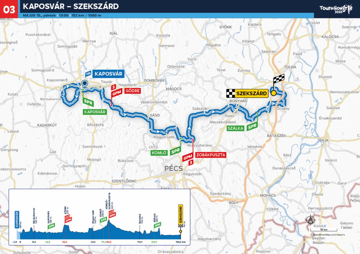 Egy újabb mezőnyhajrával kecsegtető nap vár a sprinterekre május 15-én. A Tour de Hongrie 3. szakasza Kaposvárról indul, majd egy rövid zselici kört követően kelet felé folytatódik. A szekszárdi befutó előtt 152 km, három gyorsasági és két hegyi részhajrá, illetve több mint 1000 méter szintemelkedés vár a versenyzőkre.