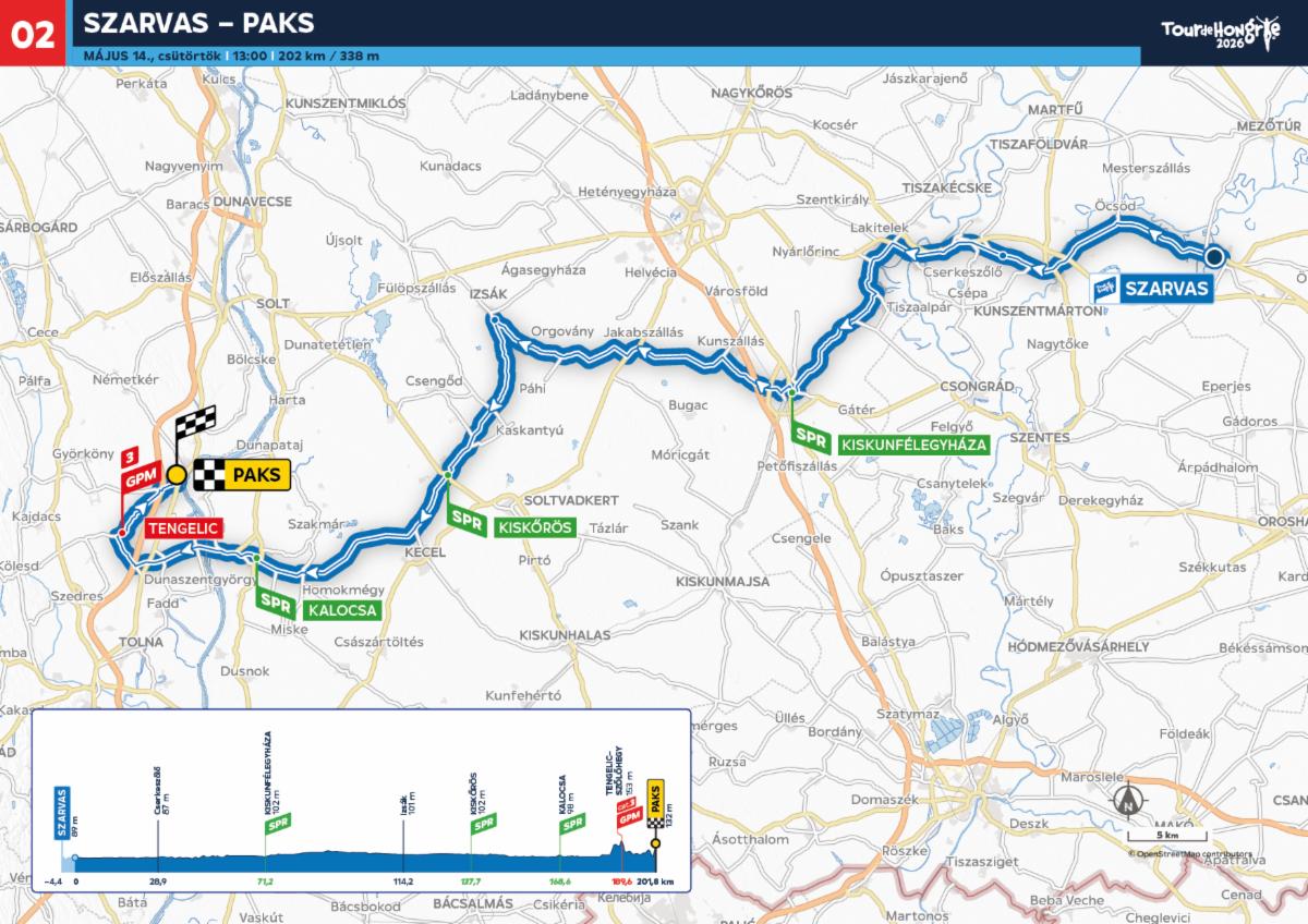 Május 14-én egy újabb város debütál a Tour de Hongrie házigazdájaként. Szarvasról nyugat felé veszi az irányt a mezőny, mely három gyorsasági részhajrát követően Kalocsánál szeli át a Dunát. A szakasz fináléjában előbb a verseny első kategorizált emelkedője, majd egy helyenként 7%-os meredekségű paksi utolsó kilométer nehezítheti a sprinterek dolgát.